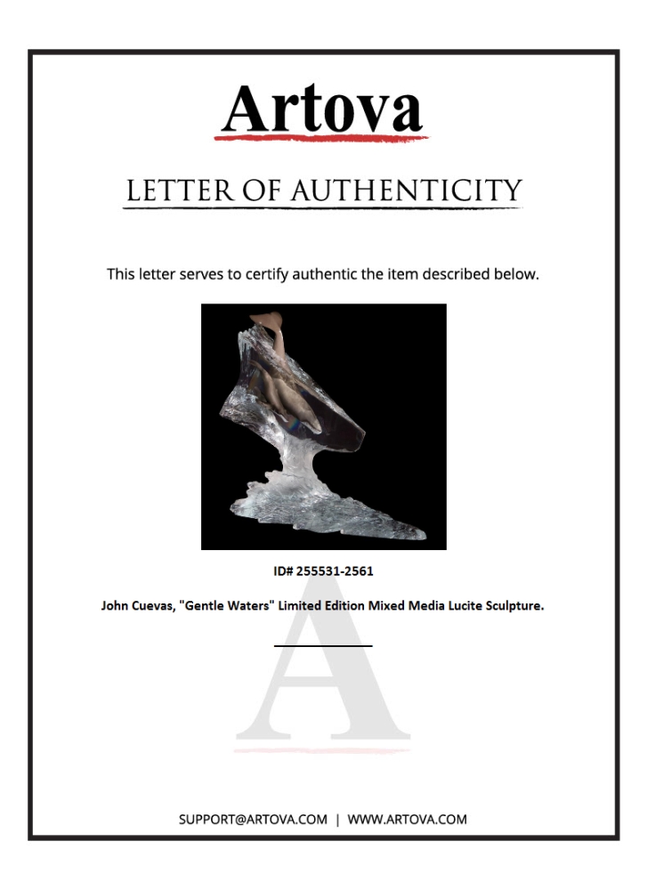 "Gentle Waters" is a limited edition mixed media lucite sculpture by John Cuevas. Engraved with the artists signature and number, this piece comes with a certificate of authenticity. Measures approximately 20" x 16" x 12". This item requires special handling and may have a longer than usual turnaround.