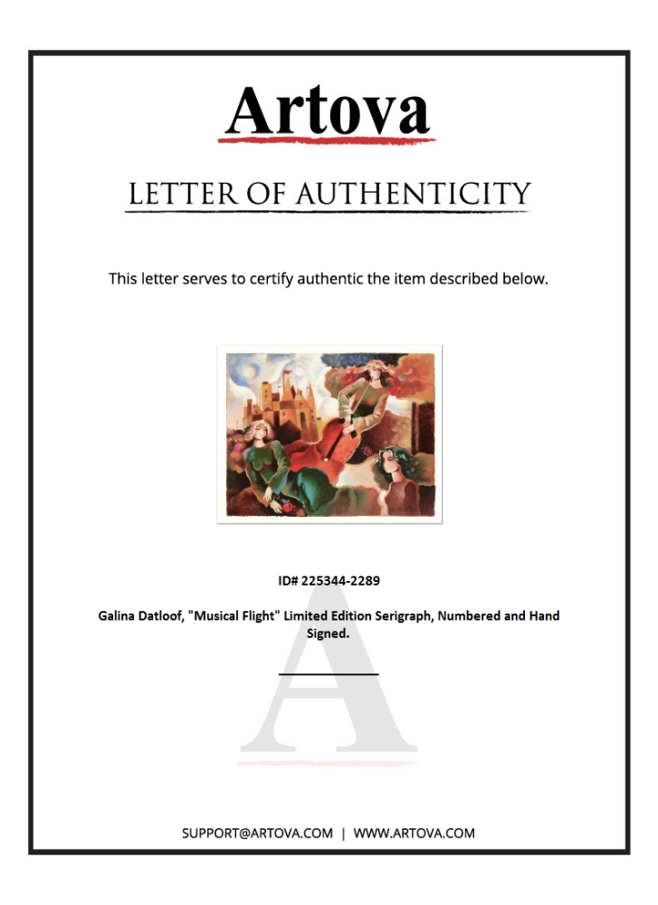 "Musical Flight" is a limited edition serigraph on paper, numbered and hand-signed by Galina Datloof. Measures approx. 17.5" x 15" (border), 16" x 12.5" (image).