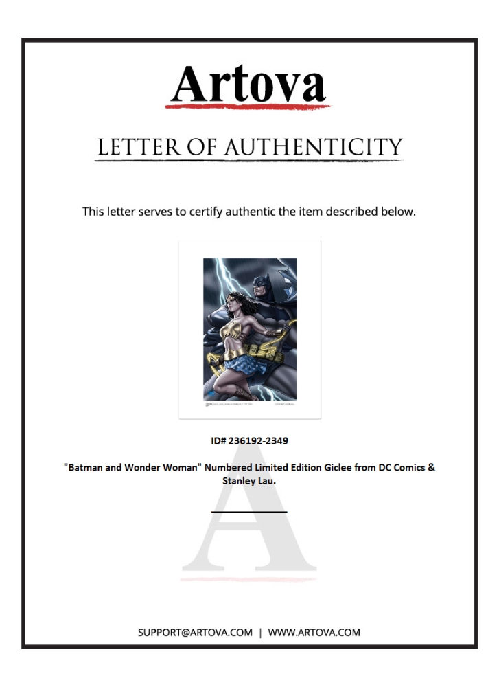 "Batman and Wonder Woman" is a limited edition giclee on paper licensed by DC Comics. Based on variant cover art done by Stanley Lau for the 2015 comic "Dark Knight III: The Master Race" of the same title, this piece is numbered and includes Certificate of Authenticity. Measures approx. 20" x 16" (with border), 16" x 12" (image).