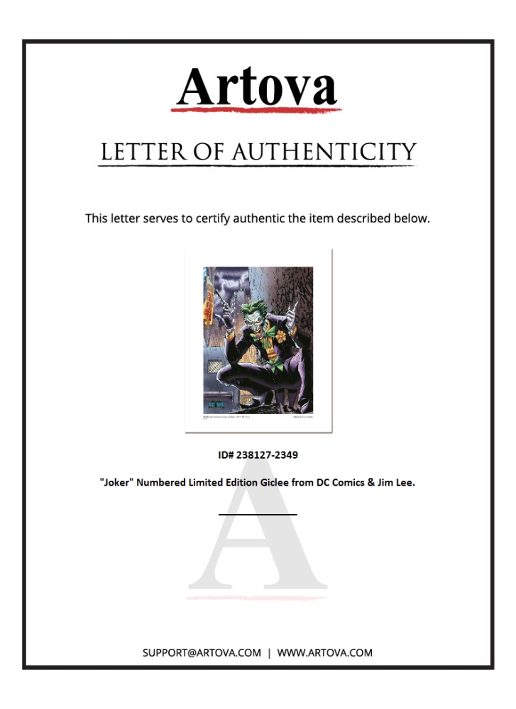 "Joker" is a limited edition giclee on paper licensed by DC Comics. Based on art done by Jim Lee for the 2003 comic "Hush", this piece is numbered and includes Certificate of Authenticity. Measures approx. 20" x 16" (with border), 16" x 12" (image).