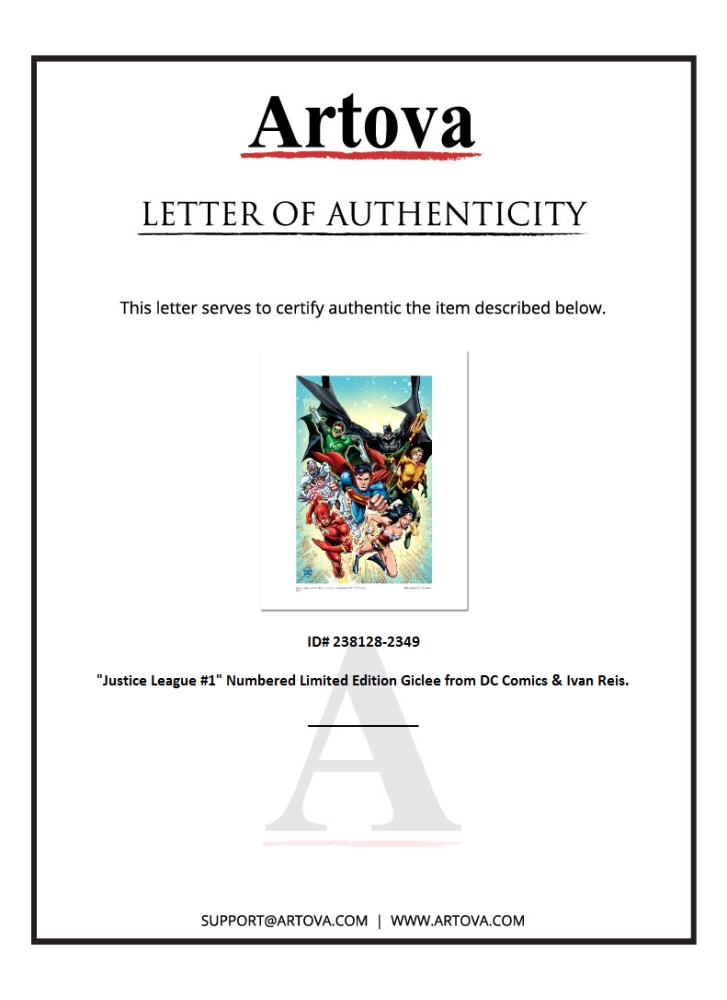 "Justice League #1" is a limited edition giclee on paper licensed by DC Comics and based on art done by Ivan Reis for the fourth print variant cover of the 2011 comic "Justice League" (The New 52). This piece is numbered and includes Certificate of Authenticity. Measures approx. 20" x 16" (with border), 16" x 12" (image).