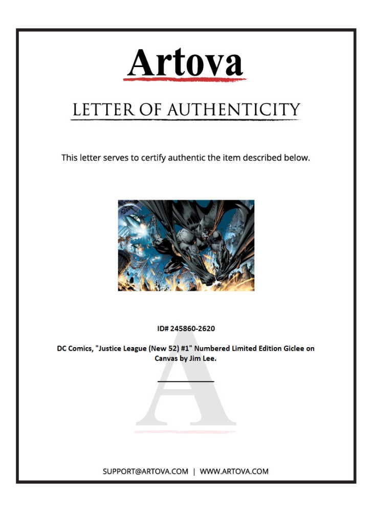 "Justice League (New 52) #1" is a limited edition giclee on canvas featuring art by Jim Lee from the 2011 comic. This piece comes gallery wrapped and includes a certificate of authenticity. Measures approximately 16" x 24" (image). This item requires special handling and may have a longer than usual turnaround.