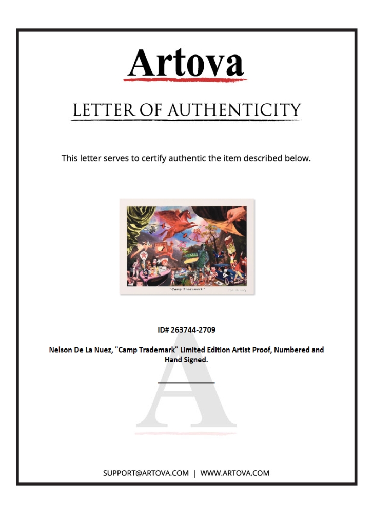 "Camp Trademark" is a limited edition artist proof on paper by Nelson De La Nuez, numbered and hand signed by the artist. Includes Letter of Authenticity. Measures approx. 15" x 10".