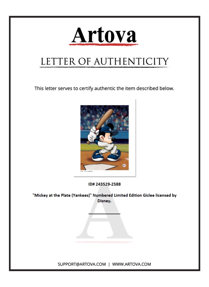"Mickey at the Plate (Yankees)" is a limited edition giclee on paper licensed by Disney featuring Mickey Mouse in New York Yankees MLB uniform. It comes numbered and with a Certificate of Authenticity! Measures approx. 16 x 20" (with border), 12" x 16" (image).