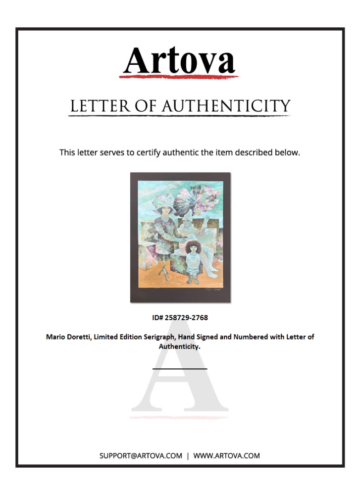 This is a limited edition serigraph on paper by Mario Doretti. The piece comes hand-signed by the artist, numbered, and with a letter of authenticity. Measures approximately 15.5" x 12.5".