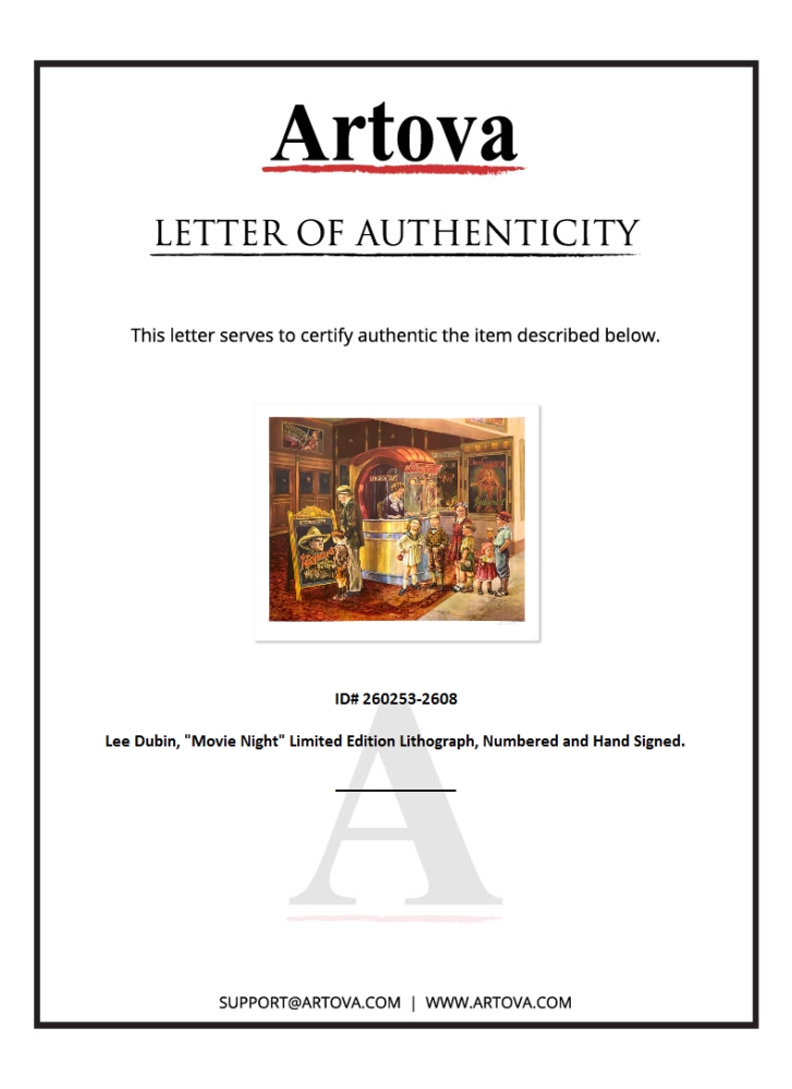 "Movie Night" is a limited edition lithograph on paper by Lee Dubin, numbered and hand-signed by the artist. Includes Letter of Authenticity. Measures approx. 34" x 28" (with border), 30" x 24" (image). Due to the age of this piece there may be minor imperfections on the paper but the piece is in overall good condition.