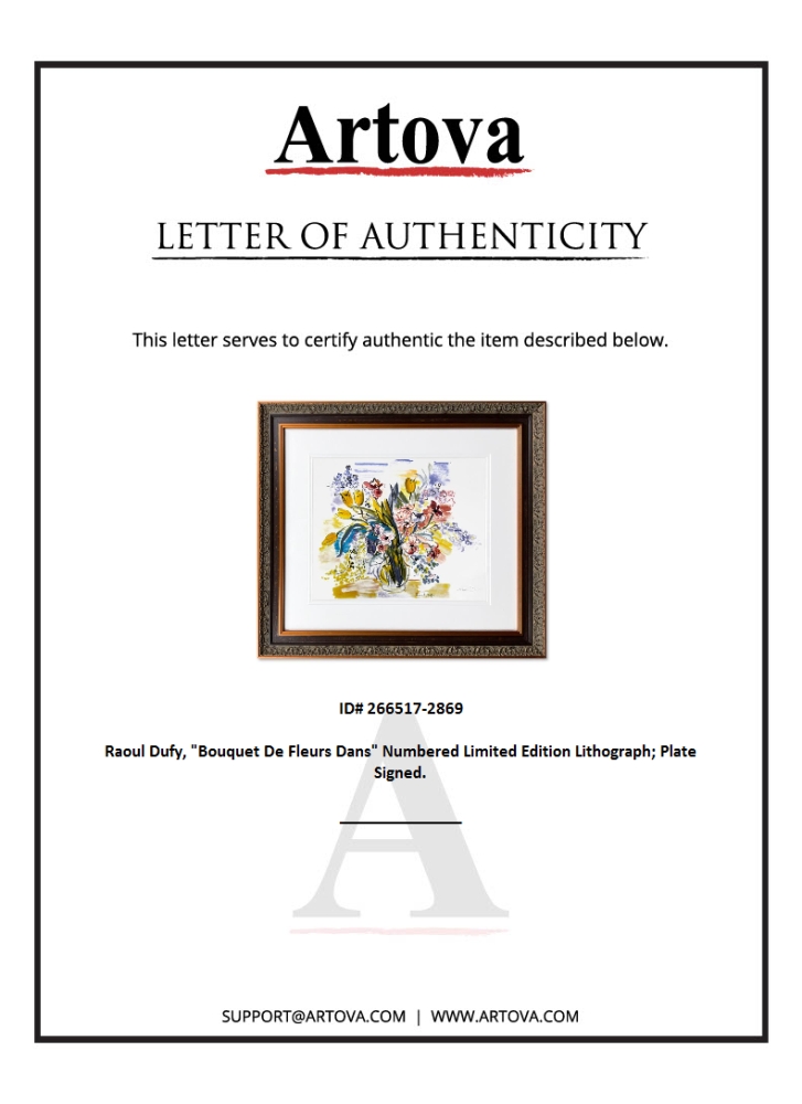 "Bouquet De Fleurs Dans" is a framed limited edition lithograph on paper by Raoul Dufy authorized by Dufy owners of rights and ADAGP Paris. The piece is plate signed and comes with a certificate of authenticity. Measures approximately 28.5" x 26.5" (frame), 18" x 21.5" (image).