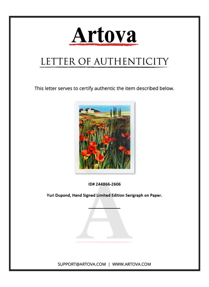 This is a limited edition serigraph on paper by Yuri Dupond. It is numbered and hand-signed and includes a letter of authenticity. Measures approximately 12" x 9.5" (image).
