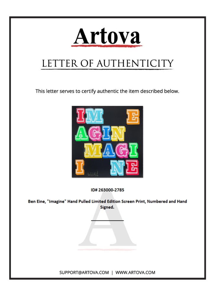 "Imagine" is a hand pulled limited edition screen print on paper with a spot varnish and hand deckled edges by Ben Eine. This piece is numbered and signed by the artist. Comes custom framed with Letter of Authenticity. Measures approx. 33.5" x 33.5" (frame), 27.5" x 27.5" (image).