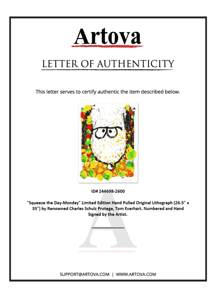 "Squeeze the Day-Monday" is a limited edition hand pulled original lithograph on museum quality deckle-edge paper, numbered and hand-signed by Tom Everhart. This is one of the final Everhart editions to be created on a rare, antique Marinoni Voirin lithograph press that dates back to the 1800's. Includes certificate of authenticity. Measures approx. 29" x 38.5" (with border); 26.5" x 35" (image).