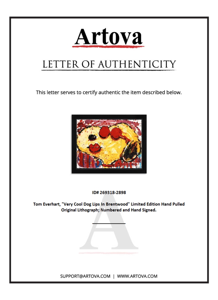 "Very Cool Dog Lips in Brentwood" is a limited edition hand pulled original lithograph on museum quality deckle-edge paper by Tom Everhart. The piece is numbered, and hand signed by the artist. This is one of the final Everhart editions to be created on a rare, antique Marinoni Voirin lithograph press that dates back to the 1800's. The piece comes framed and includes a letter of authenticity. Measures approximately 34" x 26.5" (framed), 30" x 22.5" (image).