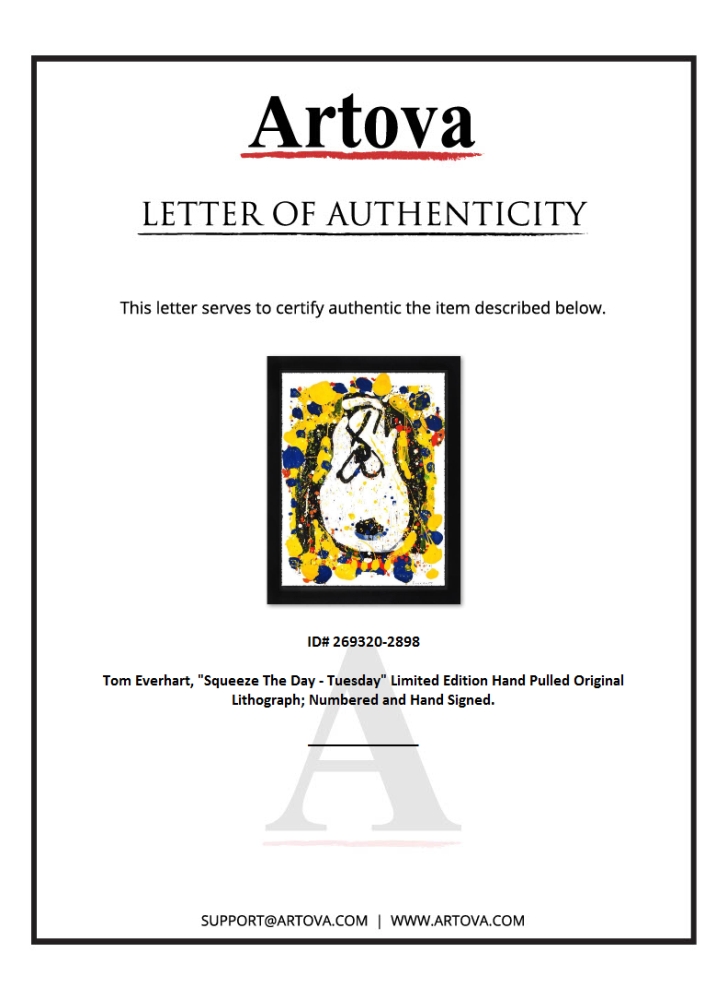 "Squeeze The Day-Tuesday" is a limited edition hand pulled original lithograph on museum quality deckle-edge paper by Tom Everhart. The piece is numbered, and hand signed by the artist. This is one of the final Everhart editions to be created on a rare, antique Marinoni Voirin lithograph press that dates back to the 1800's. The piece comes framed and includes a letter of authenticity. Measures approximately 33" x 42.5" (framed), 29" x 38.5" (image).
