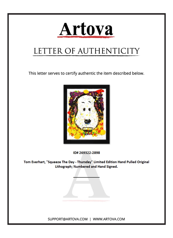 "Squeeze The Day-Thursday" is a limited edition hand pulled original lithograph on museum quality deckle-edge paper by Tom Everhart. The piece is numbered, and hand signed by the artist. This is one of the final Everhart editions to be created on a rare, antique Marinoni Voirin lithograph press that dates back to the 1800's. The piece comes framed and includes a letter of authenticity. Measures approximately 31.5" x 41" (framed), 27.5" x 37" (image).