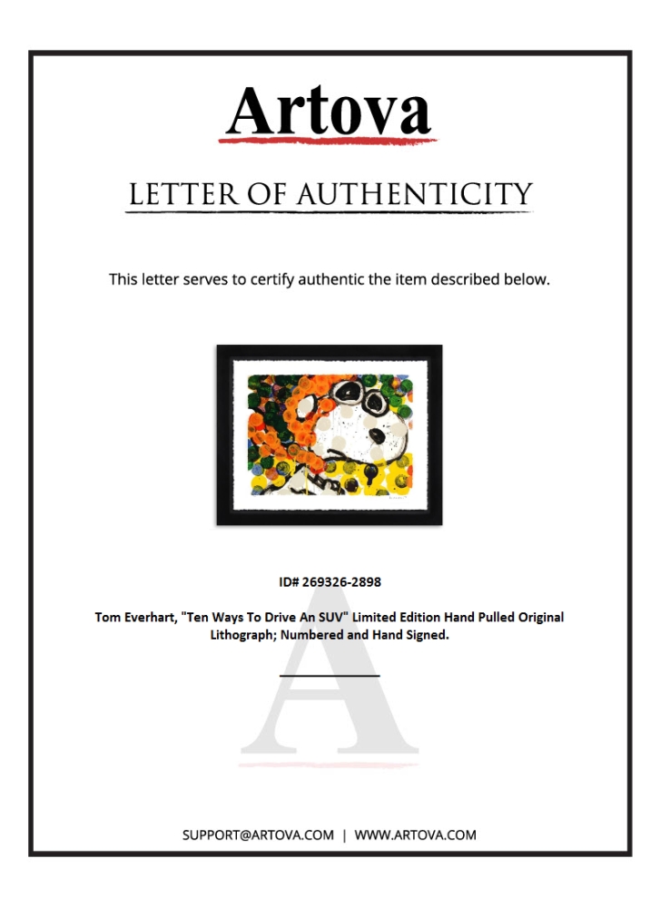 "Ten Ways to Drive an SUV" is a limited edition hand pulled original lithograph on museum quality deckle-edge paper by Tom Everhart. The piece is numbered, and hand signed by the artist. This is one of the final Everhart editions to be created on a rare, antique Marinoni Voirin lithograph press that dates back to the 1800's. The piece comes framed and includes a letter of authenticity. Measures approximately 35" x 26.5" (framed), 31" x 22.5" (image).
