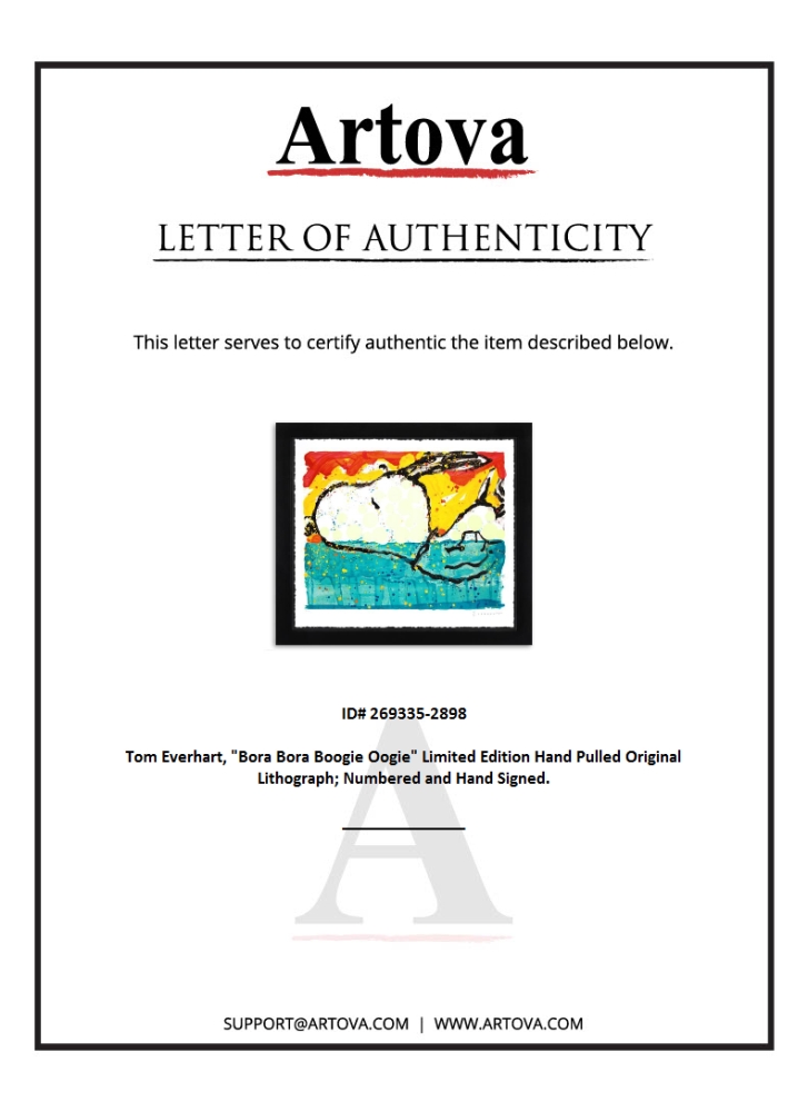 "Bora Bora Boogie Oogie" is a limited edition hand pulled original lithograph on museum quality deckle-edge paper by Tom Everhart. The piece is numbered, and hand signed by the artist. This is one of the final Everhart editions to be created on a rare, antique Marinoni Voirin lithograph press that dates back to the 1800's. The piece comes framed and includes a letter of authenticity. Measures approximately 36" x 27" (framed), 32" x 23" (image).