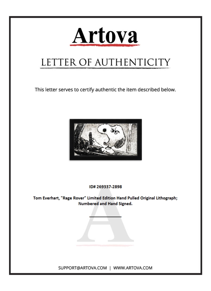 "Rage Rover" is a limited edition hand pulled original lithograph on museum quality deckle-edge paper by Tom Everhart. The piece is numbered, and hand signed by the artist. This is one of the final Everhart editions to be created on a rare, antique Marinoni Voirin lithograph press that dates back to the 1800's. The piece comes framed and includes a letter of authenticity. Measures approximately 53" x 28.5" (framed), 49" x 24.5" (image).
