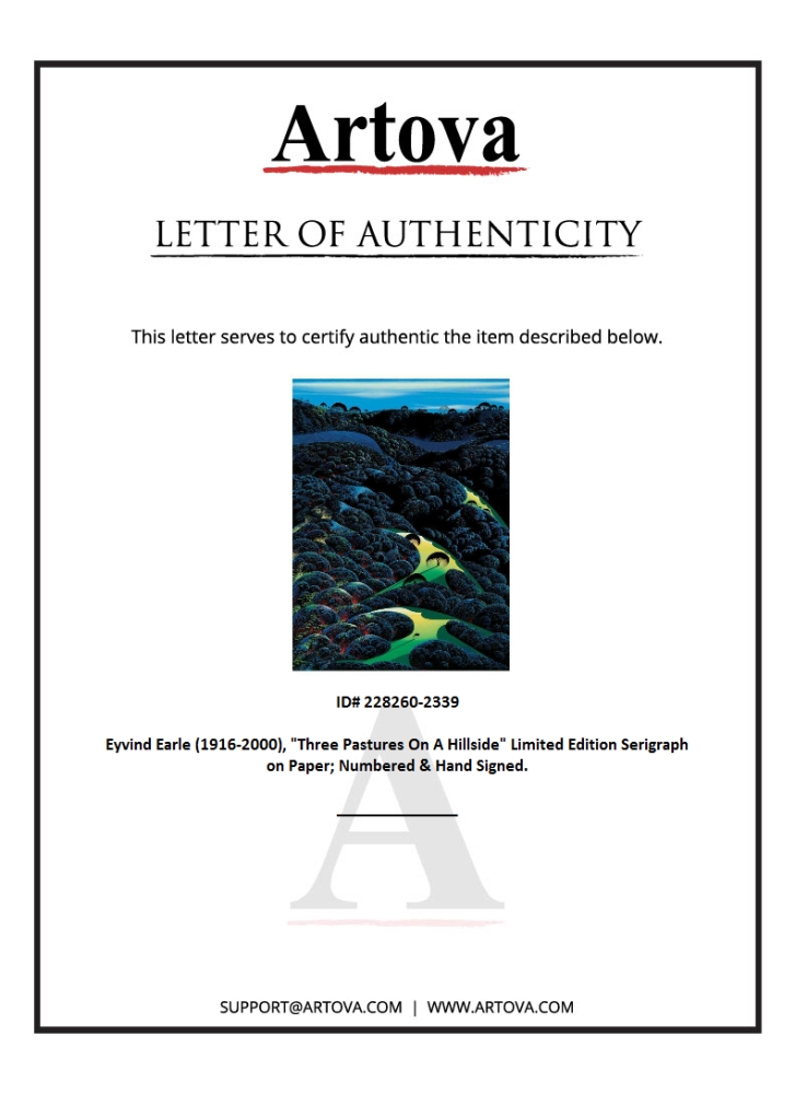 "Three Pastures On A Hillside" is a limited edition serigraph on paper by Eyvind Earle (1916-2000). The piece is numbered, hand-signed by the artist, and accompanied by a certificate of authenticity. Measures approximately 27" x 36" (image).