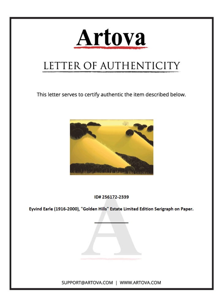 "Golden Hills" is an estate limited edition serigraph on paper by Eyvind Earle (1916-2000). The piece is numbered, gold stamped with the artist's trademark signature by Eyvind Earle Publishing LLC. and accompanied by a certificate of authenticity. Measures approximately 36" x 24" (image).