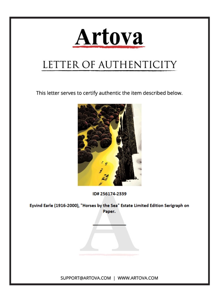 "Horses by the Sea" is an estate limited edition serigraph on paper by Eyvind Earle (1916-2000). The piece is numbered, gold stamped with the artist's trademark signature by Eyvind Earle Publishing LLC. and accompanied by a certificate of authenticity. Measures approximately 30" x 40" (image).