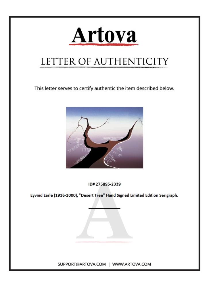 "Desert Tree" is a limited edition serigraph on paper by Eyvind Earle (1916-2000). The piece is numbered, hand-signed by the artist, and accompanied by a certificate of authenticity. Measures approximately 8" x 10" (image).