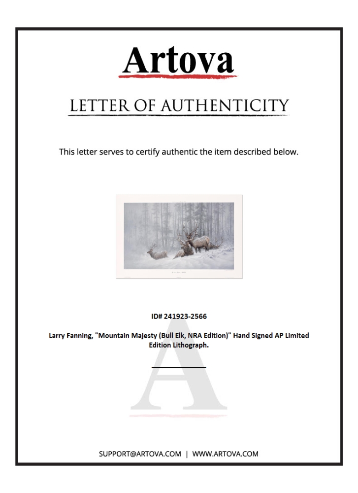 "Mountain Majesty" is a limited NRA edition lithograph on paper by Larry Fanning. Numbered and hand-signed, the piece comes with a letter of authenticity. Measures approximately 32.5" x 19.5" (image).