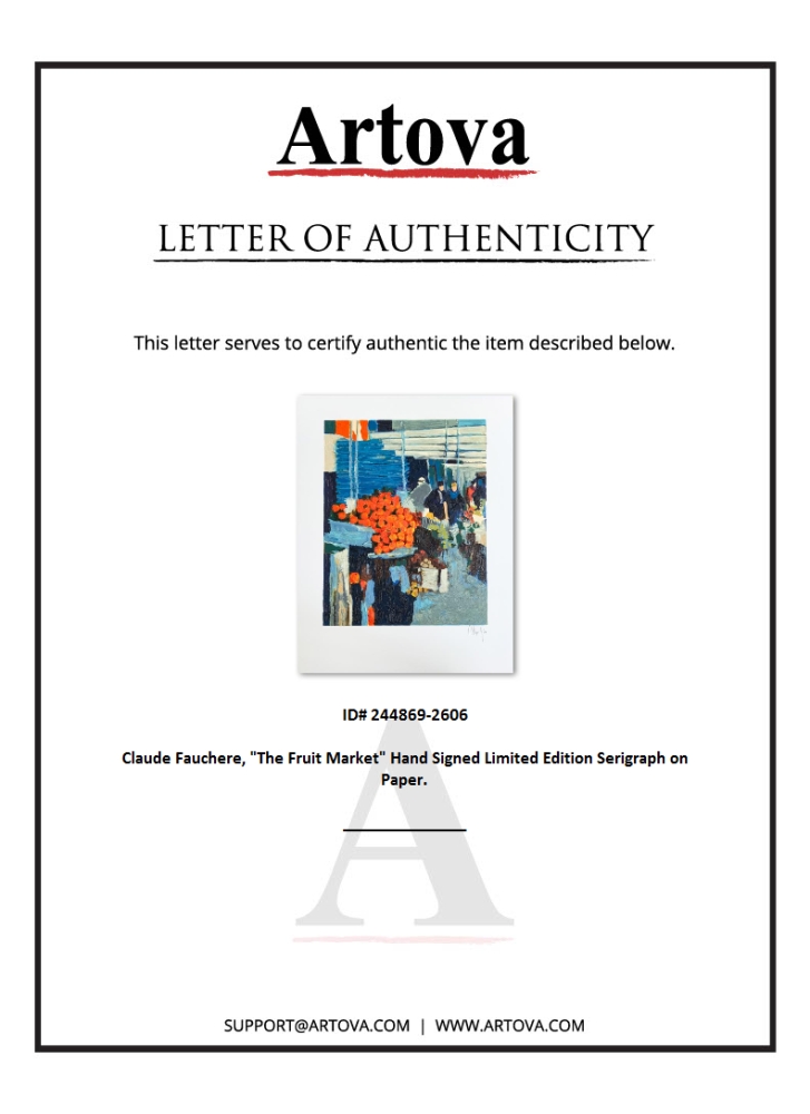 "The Fruit Market" is a limited edition serigraph on paper by Claude Fauchere. It is numbered and hand-signed and includes a letter of authenticity. Measures approximately 15.5" x 11.5" (image).