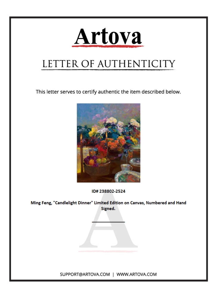 "Candlelight Dinner" is a limited edition giclee on canvas by Ming Feng, Numbered and hand-signed by the artist. Includes Letter of Authenticity. Measures approx. 24" x 30" (image).