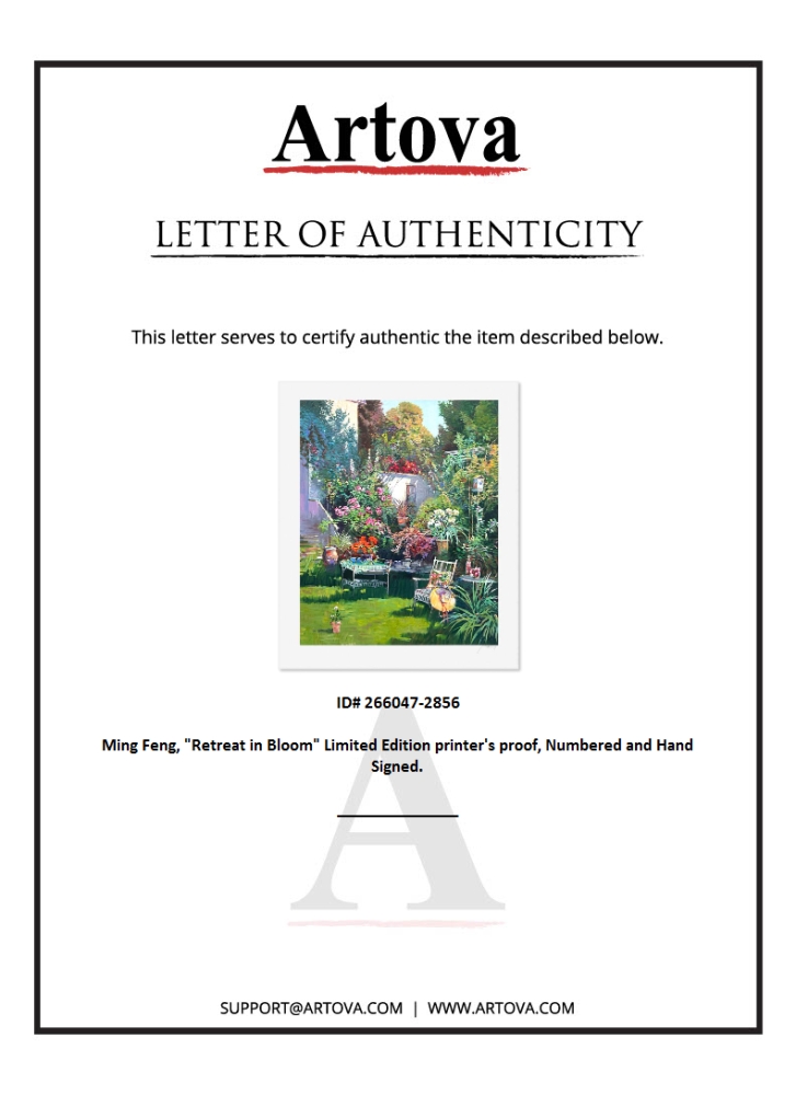 "Retreat in Bloom" is a limited edition printer's proof serigraph on paper by Ming Feng, numbered and hand signed by the artist. Includes Letter of Authenticity. Measures approx. 35.5" x 29" (border), 30" x 24" (image).