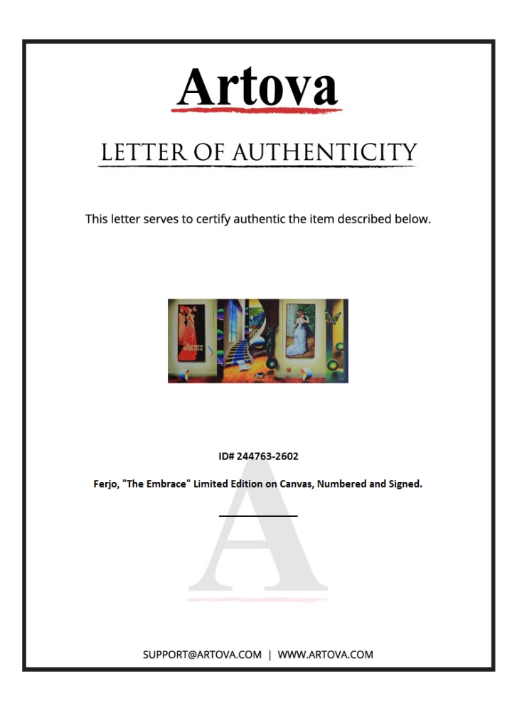 "The Embrace" is a limited edition giclee on canvas, bearing Ferjo's authorized signature. Includes Letter of Authenticity. Measures approx. 48" x 24" (image). This item requires special handling and may have a longer than usual turnaround.