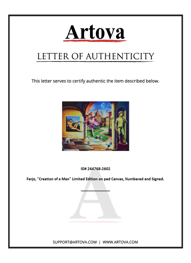 "Creation of a Man" is a limited edition giclee on canvas, bearing Ferjo's authorized signature. Includes Letter of Authenticity. Measures approx. 36" x 27" (image). This item requires special handling and may have a longer than usual turnaround.
