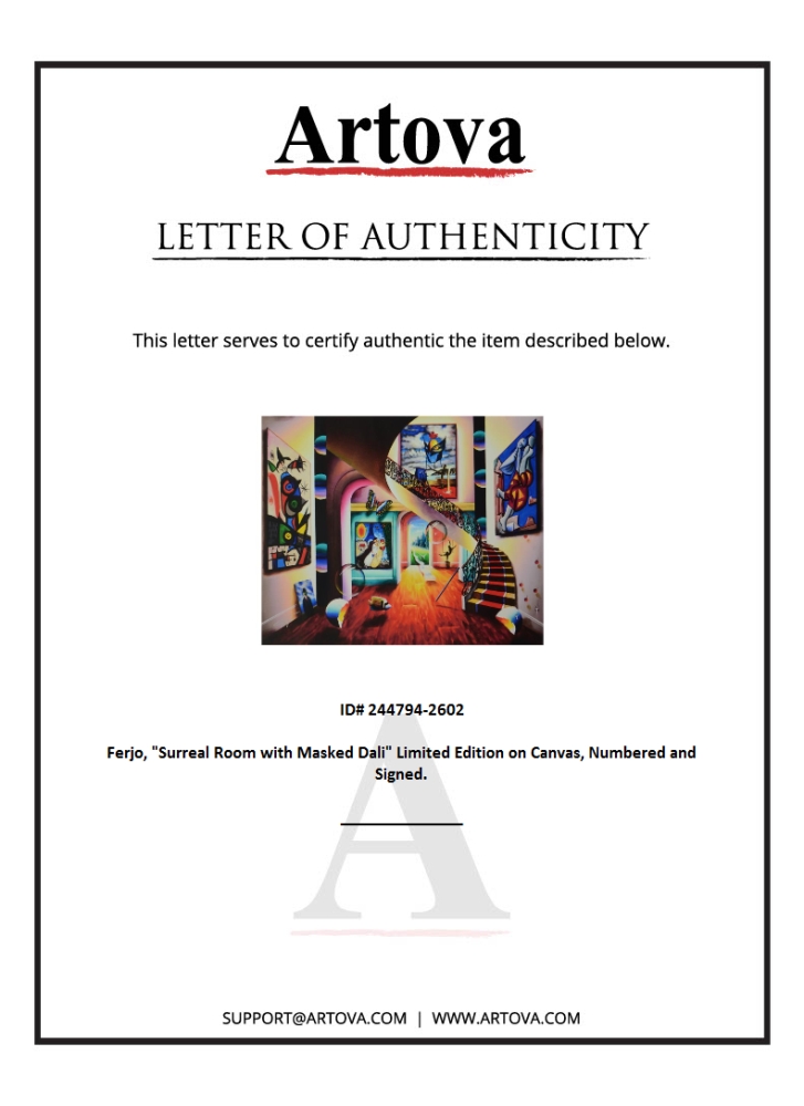 "Surreal Room with Masked Dali" is a limited edition giclee on canvas, bearing Ferjo's authorized signature. Includes Letter of Authenticity. Measures approx. 20" x 16" (image). This item requires special handling and may have a longer than usual turnaround.