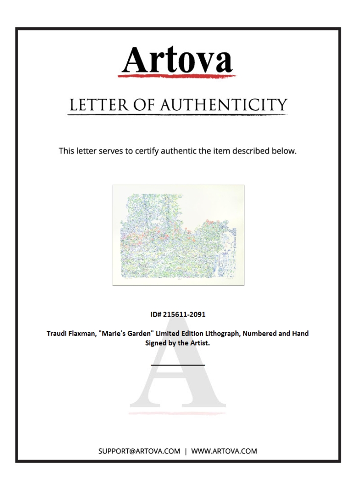 "Marie's Garden" is a limited edition lithograph on paper by Traudi Flaxman, numbered and hand-signed by the artist! Measures approx. 28.5" x 21.5" (with border); 25" x 18" (image).