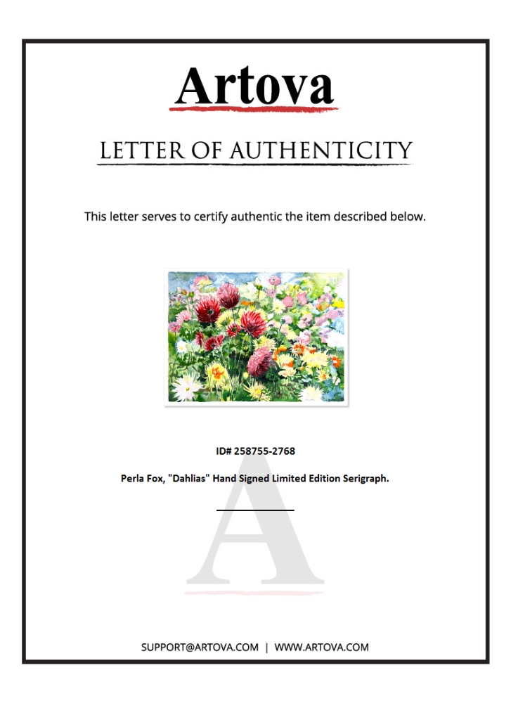 "Dahlias" is a limited edition serigraph on paper by Perla Fox. The piece comes hand-signed by the artist, numbered, and with a letter of authenticity. Measures approximately 18" x 24.5".