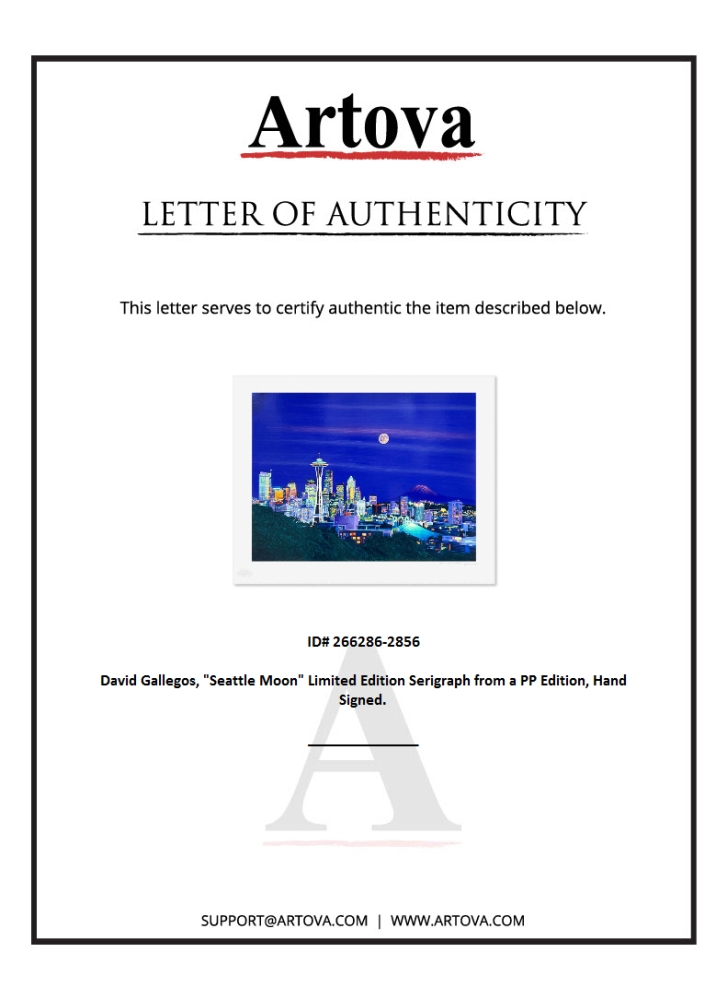 "Seattle Moon" is a limited edition serigraph from a PP Edition on paper by David Gallegos, hand signed by the artist. Includes Letter of Authenticity. Measures approx. 29" x 35" (border), 23" x 30" (image).