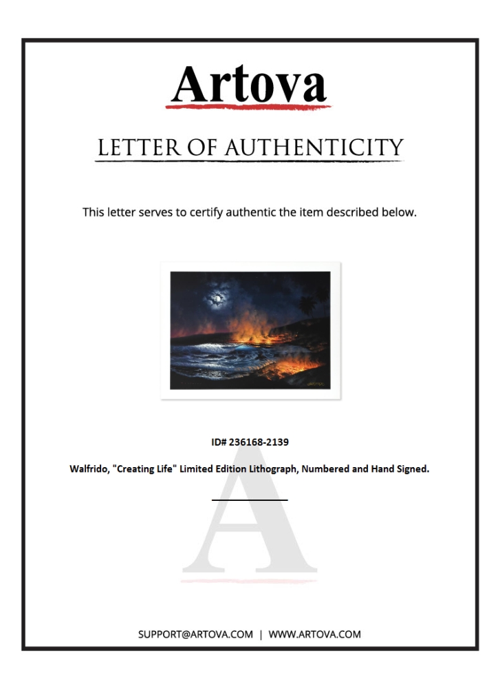 "Creating Life" is a limited edition lithograph on paper, numbered and hand signed by Walfrido. Includes Letter of Authenticity and measures approximately 26" x 20" (border), 23" x 17" (image). There is a small faint depression crease on the bottom-center park of the image (dark area).