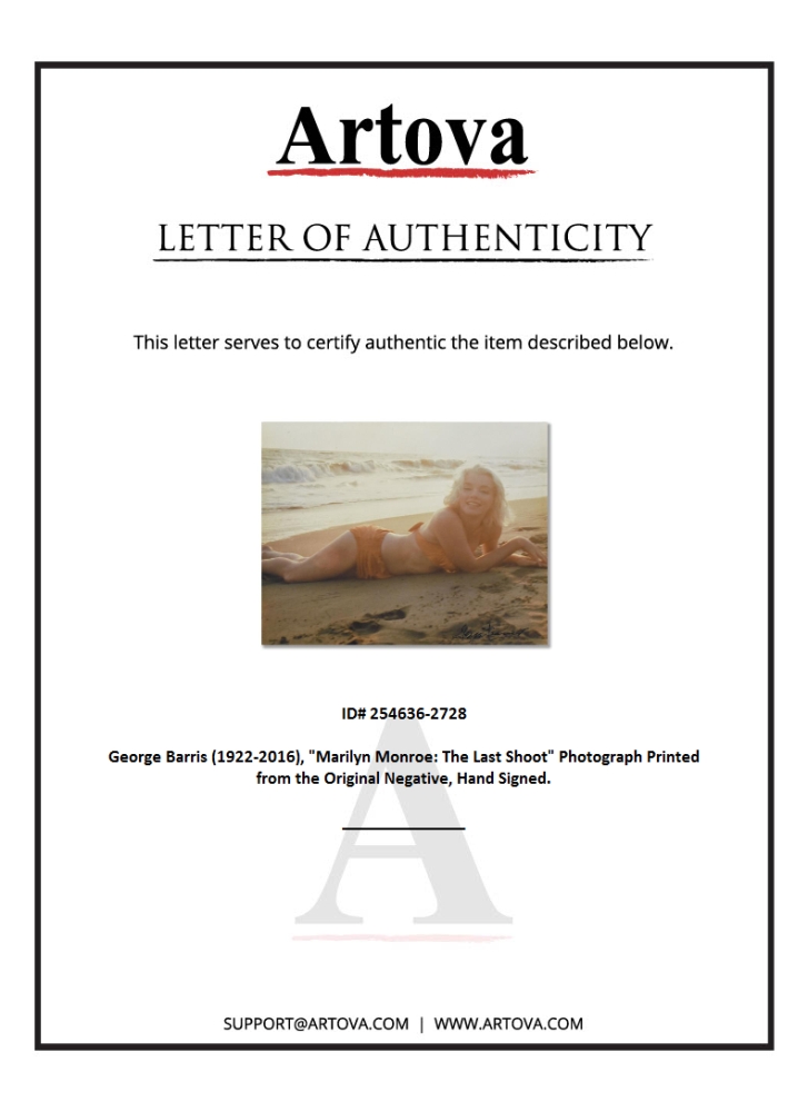 "Marilyn Monroe: The Last Shoot" is a photograph printed from the original negative taken by George Barris (1922-2016). This photo is part of a series entitled "The Last Photos" which were taken in 1962 just two weeks before Monroe's death and are considered the last photos ever taken of the icon. This piece is hand signed by the photographer and includes letter of authenticity. Measures approx. 10" x 8" (image).