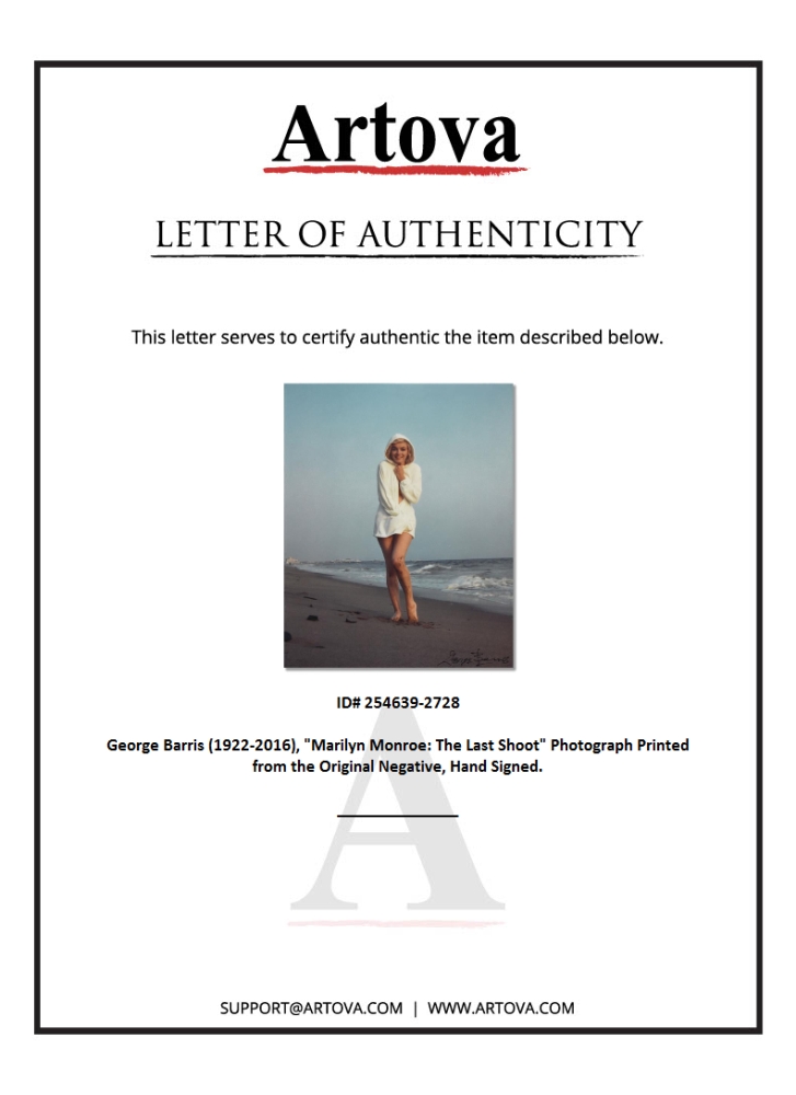 "Marilyn Monroe: The Last Shoot" is a photograph printed from the original negative taken by George Barris (1922-2016). This photo is part of a series entitled "The Last Photos" which were taken in 1962 just two weeks before Monroe's death and are considered the last photos ever taken of the icon. This piece is hand signed by the photographer and includes letter of authenticity. Measures approx. 10" x 8" (image).