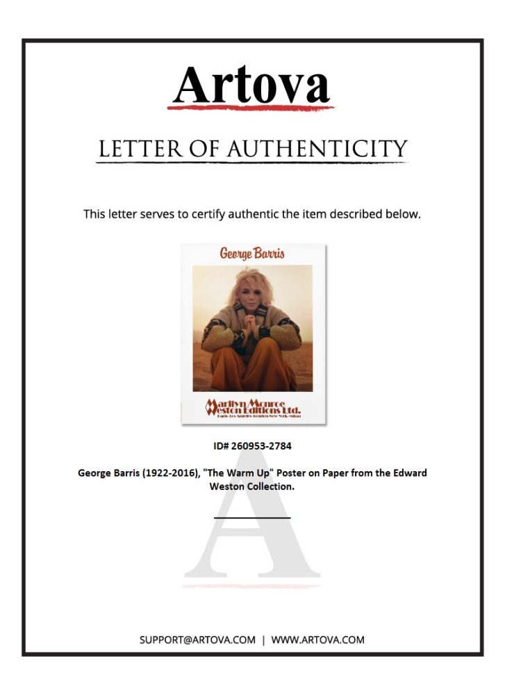 "The Warm Up" is a poster on paper by George Barris (1922-2016). This piece is dated (1987) and bears inverso the Official Edward Weston Collection Stamp and includes Letter of Authenticity. Measures approx. 23" x 30" (image). This piece has minor creases but is in overall good condition.