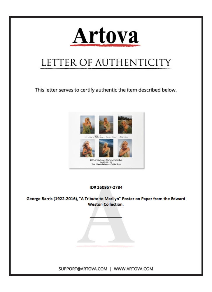 "A Tribute to Marilyn" is a poster on paper by George Barris (1922-2016). This piece is dated (1987) and bears inverso the Official Edward Weston Collection Stamp and includes Letter of Authenticity. Measures approx. 32" x 24" (image). This piece has minor creases but is in overall good condition.