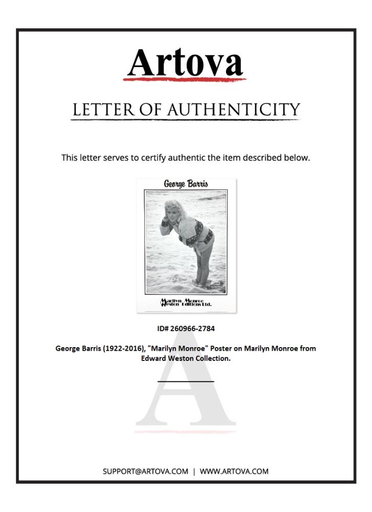 "Marilyn Monroe" is a poster on paper by George Barris (1922-2016). This piece is from the Edward Weston Collection and includes Letter of Authenticity. Measures approx. 24" x 32" (image). This piece has minor creases but is in overall good condition.