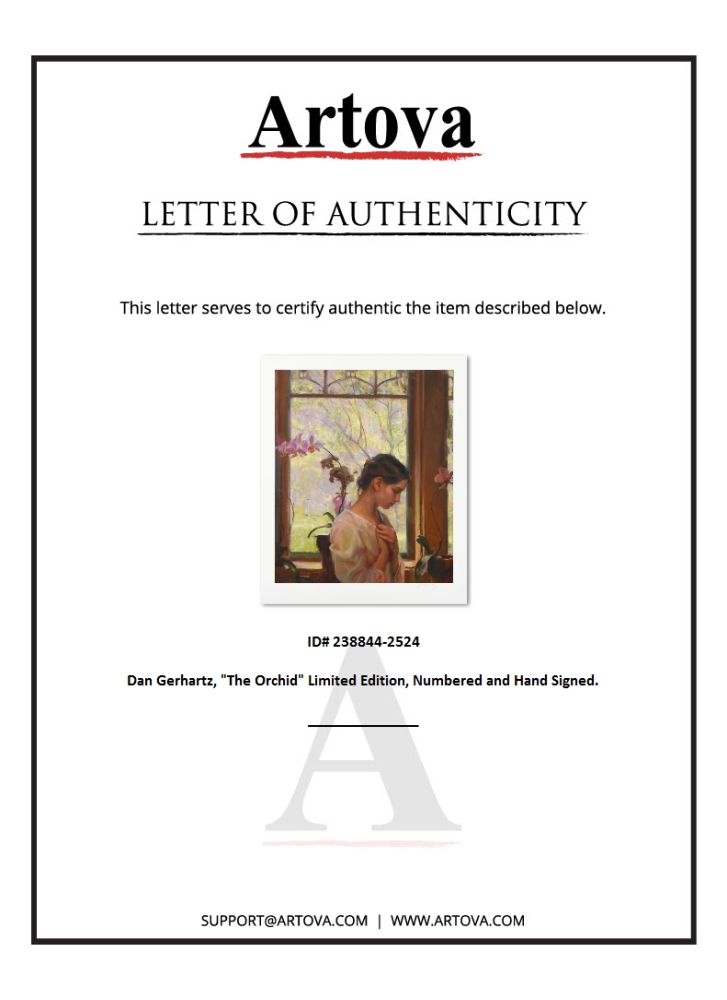 "The Orchid" is a limited edition giclee on paper by Dan Gerhartz, numbered and hand-signed by the artist. Includes Letter of Authenticity. Measures approx. 29" x 35" (border), 25" x 30" (image).