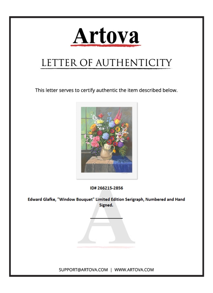 "Window Bouquet" is a limited edition serigraph on paper by Edward Glafke, numbered and hand signed by the artist. Includes Letter of Authenticity. Measures approx. 30" x 24" (border), 25.5" x 20" (image).