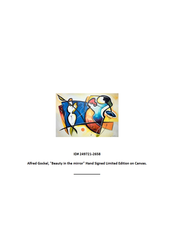 "Beauty in the mirror" is a limited edition giclee on canvas by Alfred Gockel. The piece is hand signed and numbered and comes with a letter of authenticity. Measures approximately 27" x 38.5".