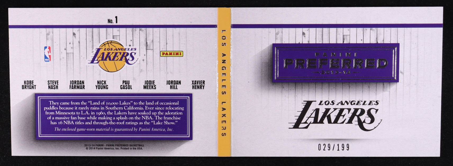 Jordan Hill / Kobe Bryant / Nick Young / Steve Nash / Jodie Meeks / Jordan Farmar / Pau Gasol / Xavier Henry 2013-14 Panini Preferred Lake Show Memorabilia #1 #029/199