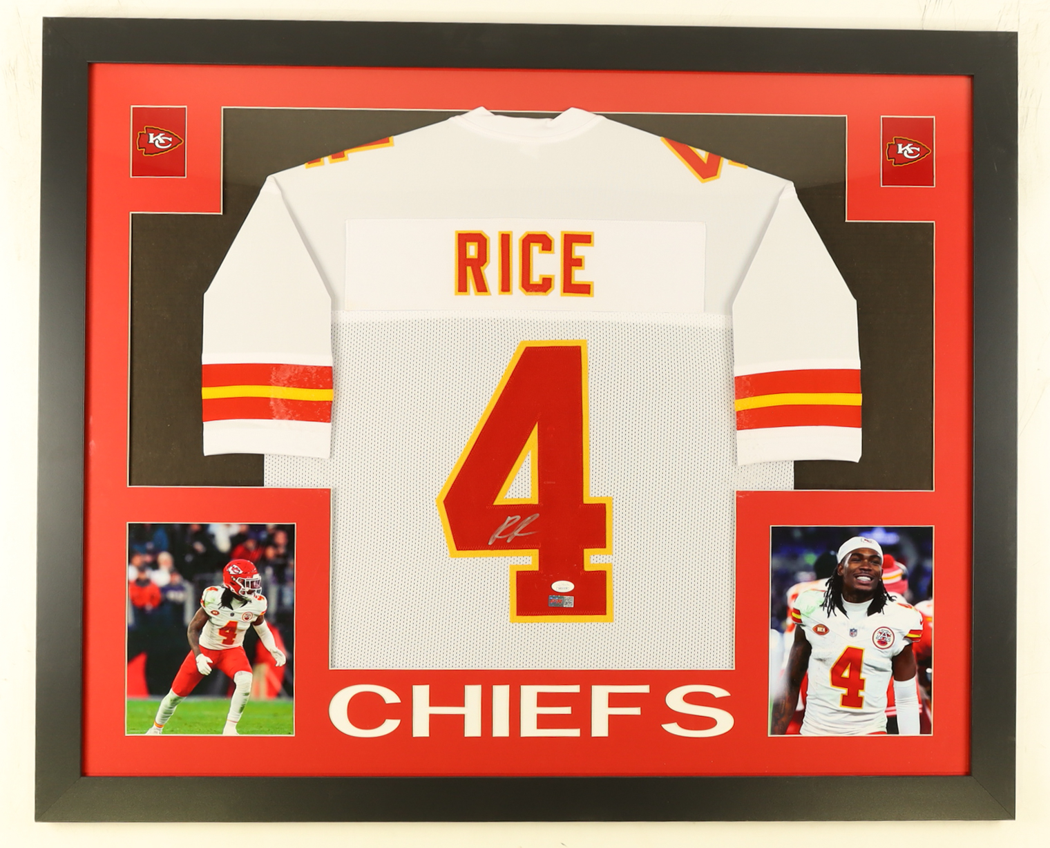 Custom framed display measures approximately 35" x 43" in size and features a jersey that has been hand signed by Rashee Rice. Please note that the 8" x 10" photos may be in reverse order.