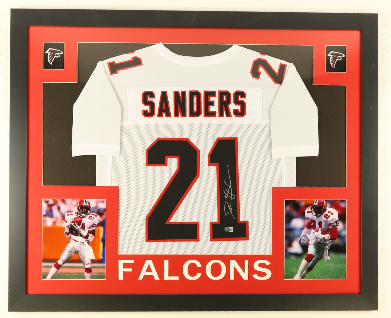 Custom framed display measures approximately 35" x 43" in size and features a jersey that has been hand-signed by Deion Sanders (HOF). Please note that the 8" x 10" photos may be in reverse order.