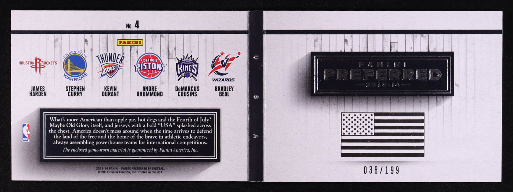 Bradley Beal / Kevin Durant / Andre Drummond / DeMarcus Cousins / James Harden / Stephen Curry 2013-14 Panini Preferred USA Memorabilia #4 #038/199