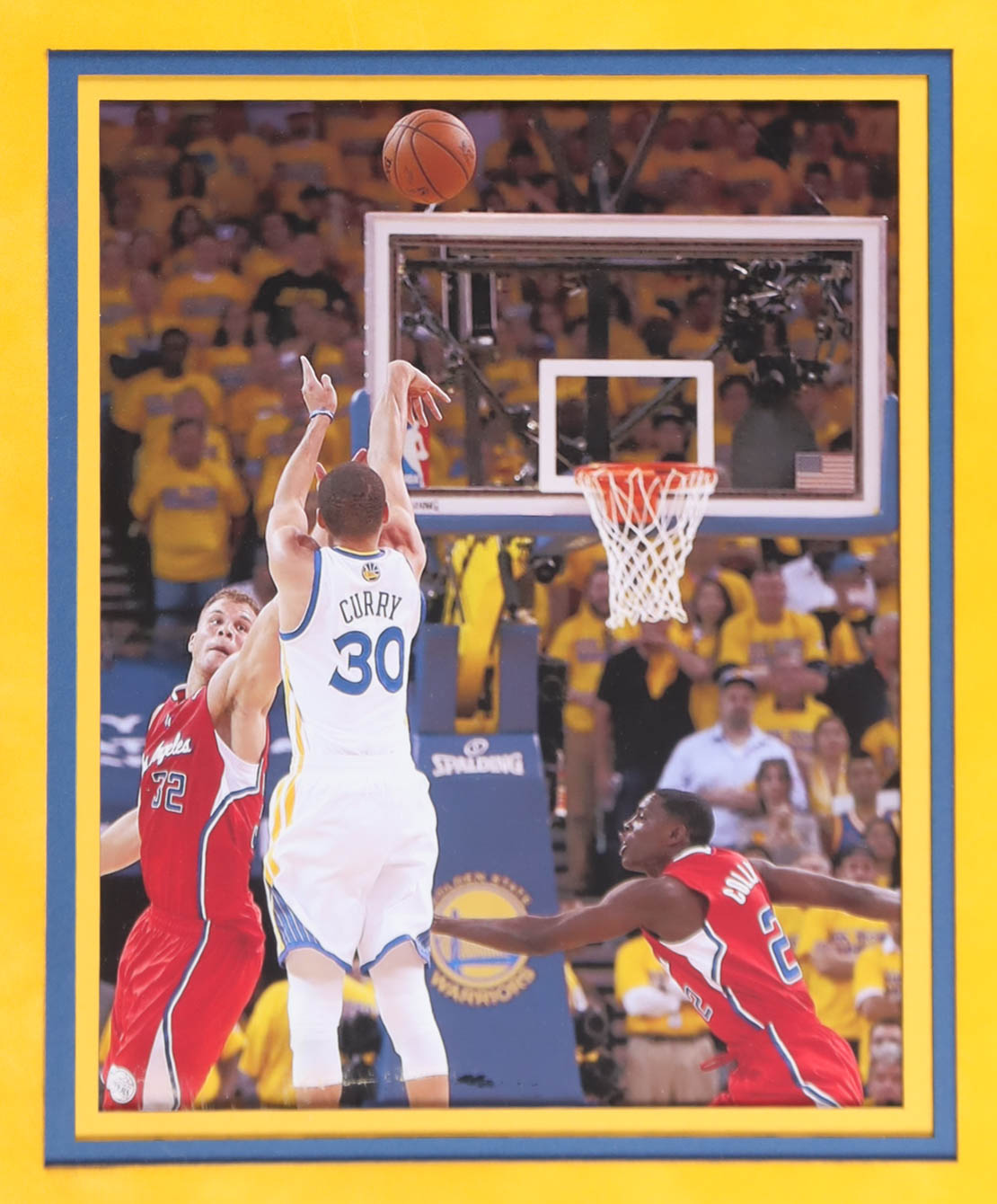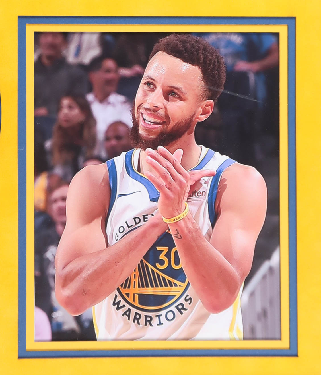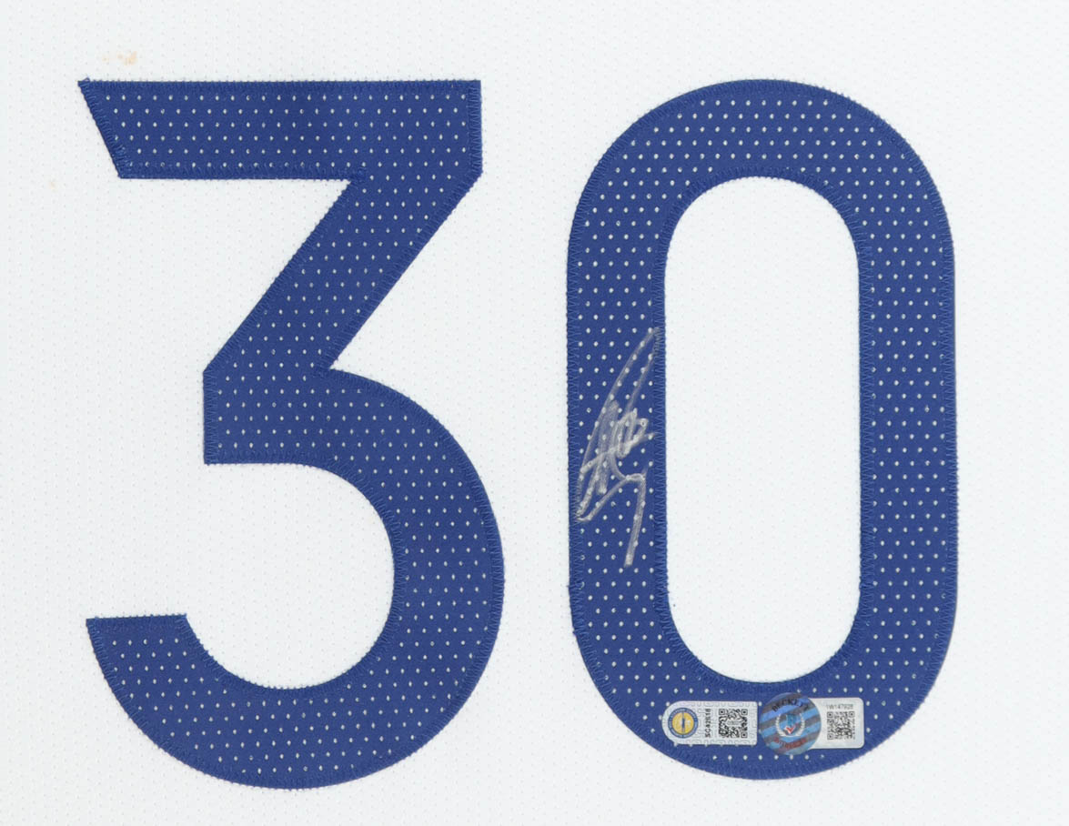 Custom frame measures 32" x 43" in size and features a jersey that has been hand-signed by Stephen Curry. Display also includes (2) 8" x 10" photos, jumbo Warriors Logo and (2) (PSA) graded sports cards. Please see photos for more details regarding the condition of the item. Description of the (2) cards is listed below.