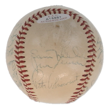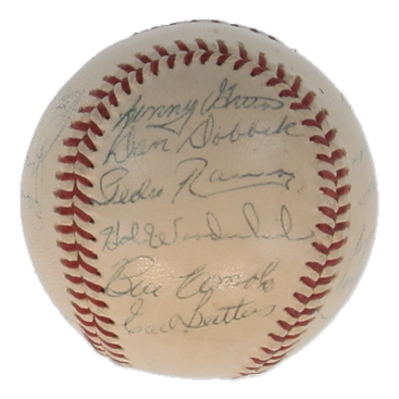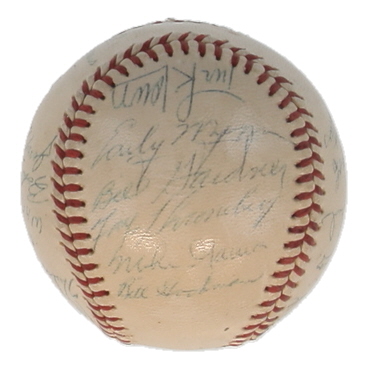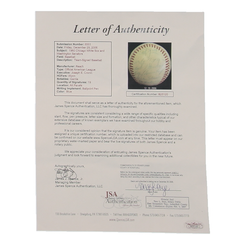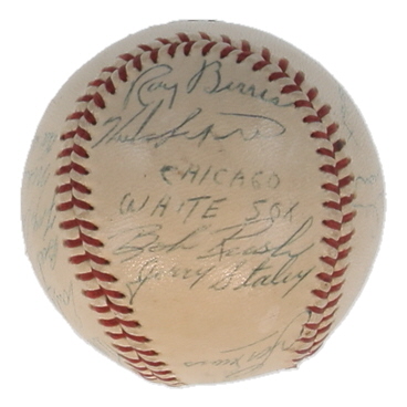 Reach Official American League baseball. Hand-signed by (19) 1960 Chicago White Sox and Washington Senators with Turk Lown, Early Wynn, Bill Gardner, Faye Throneberry, Mike Garcia, Jim Lemon, Pete Whisenant, Herb Score, Bob Rush, Roy Sievers, Lenny Greek, Dan Dobbek, Pedro Ramos, Bill Consolo, Barl Battery, and (4) others.