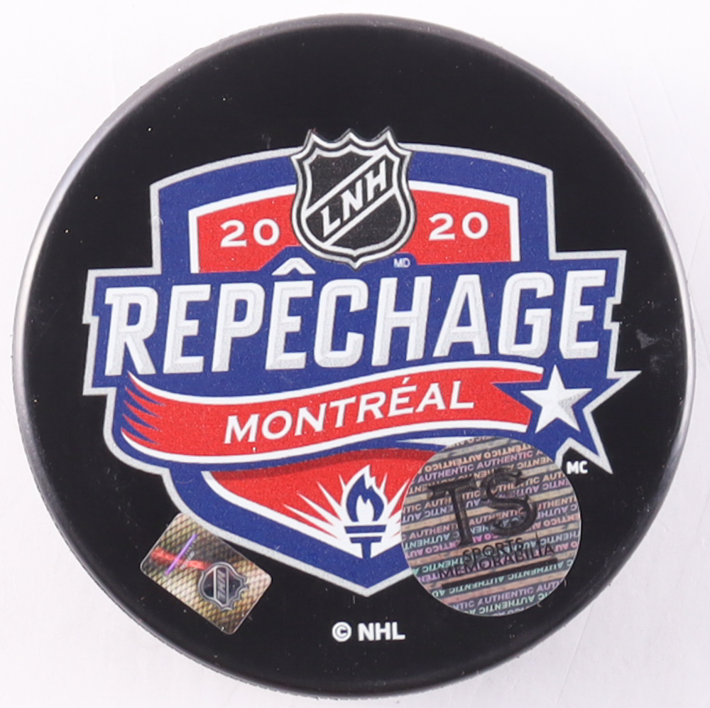2020 NHL Draft Logo Hockey Puck. Hand-signed and inscribed by Donovan Sebrango (Detroit Red Wings). Please note, there is scuffing throughout the puck.